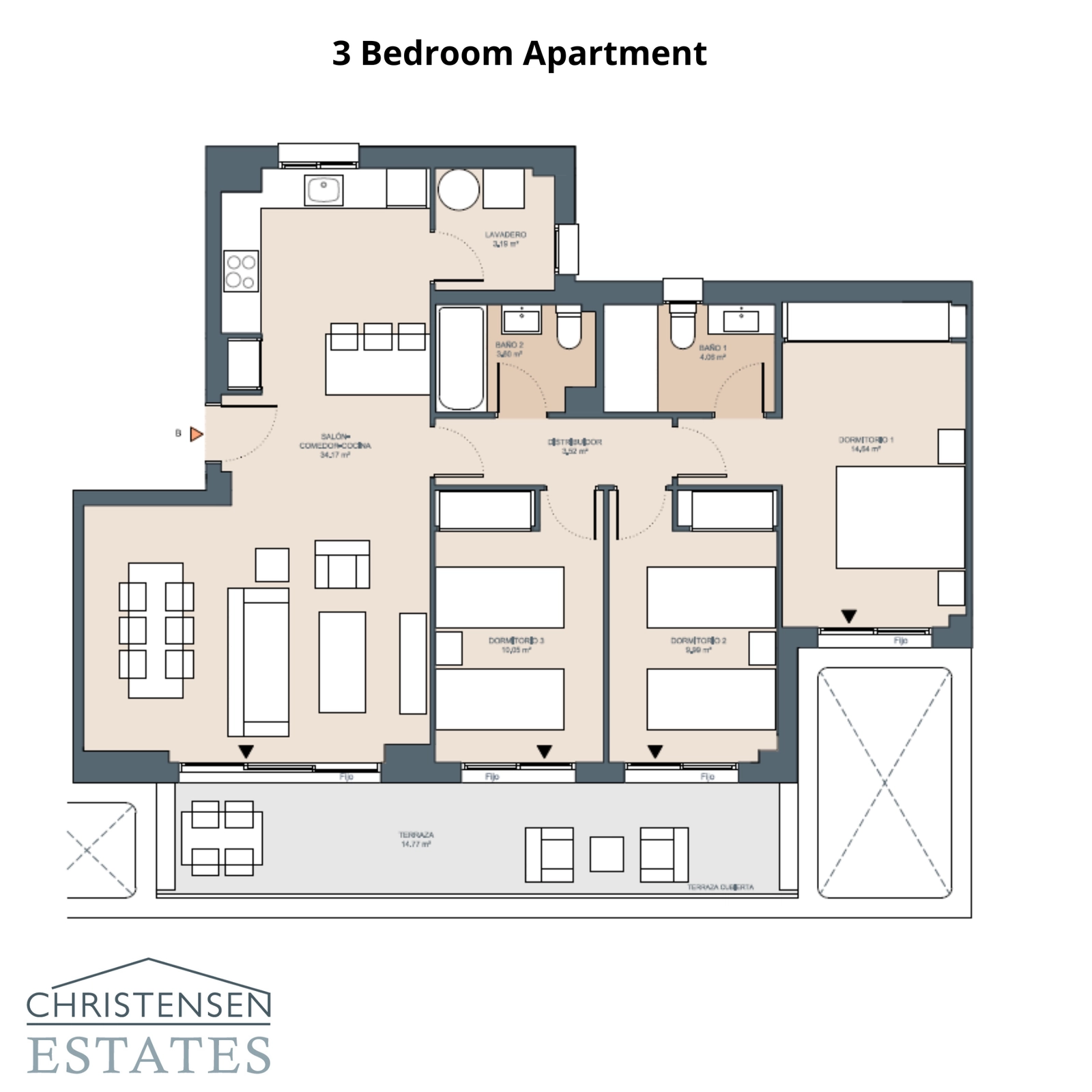 Der Grundriss des Penthouses mit zwei Schlafzimmern und einem prächtigen Dachsolarium für den ultimativen privaten Rückzugsort.